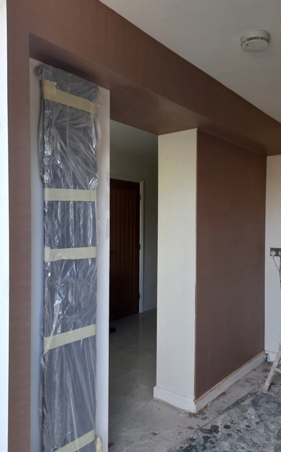 It's a powdery material added with clean water, then whisked and applied to both modern walls and plasterboard.